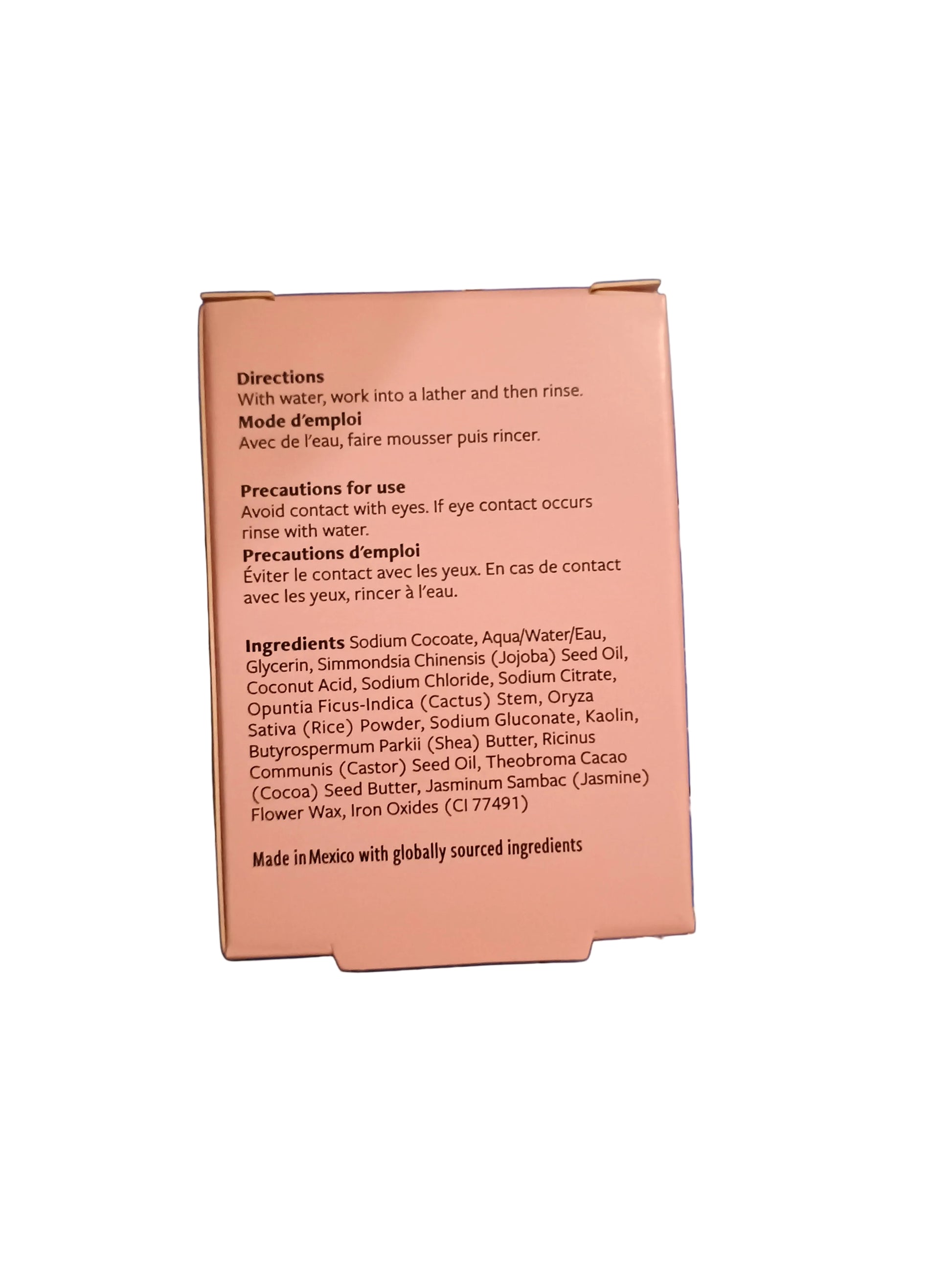 Sodium Cocoate, Aqua/Water/Eau, Glycerin, Simmondsia Chinensis (Jojoba) Seed Oil, Coconut Acid, Sodium Chloride, Sodium Citrate, Opuntia Ficus-Indica (Cactus) Stem, Oryza Sativa (Rice) Powder, Sodium Gluconate, Kaolin, Butyrospermum Parkii (Shea) Butter, Ricinus Communis (Castor) Seed Oil, Theobroma Cacao (Cocoa) Seed Butter, Jasminum Sambac (Jasmine) Flower Wax, Iron Oxides (CI 77491)