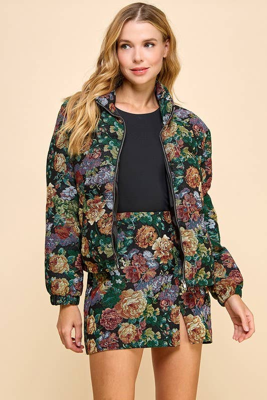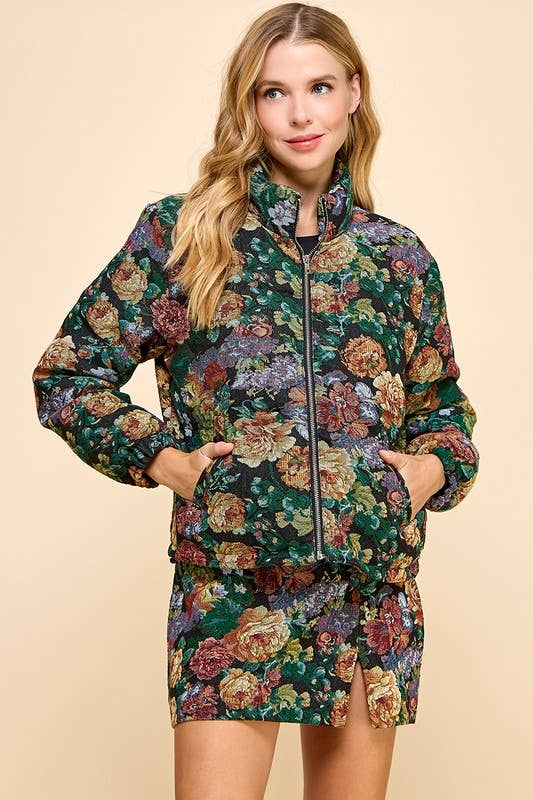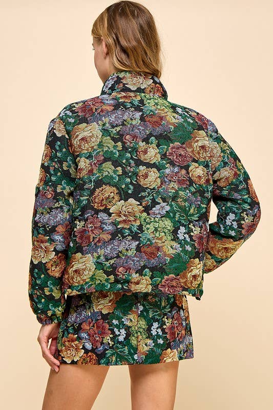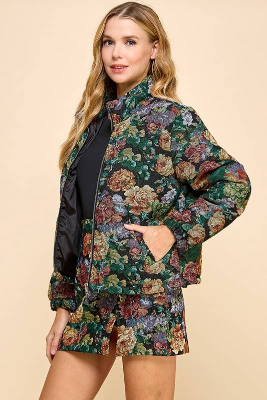 Corduroy, floral printed puffer jacket with side pockets and a front zipper closure.