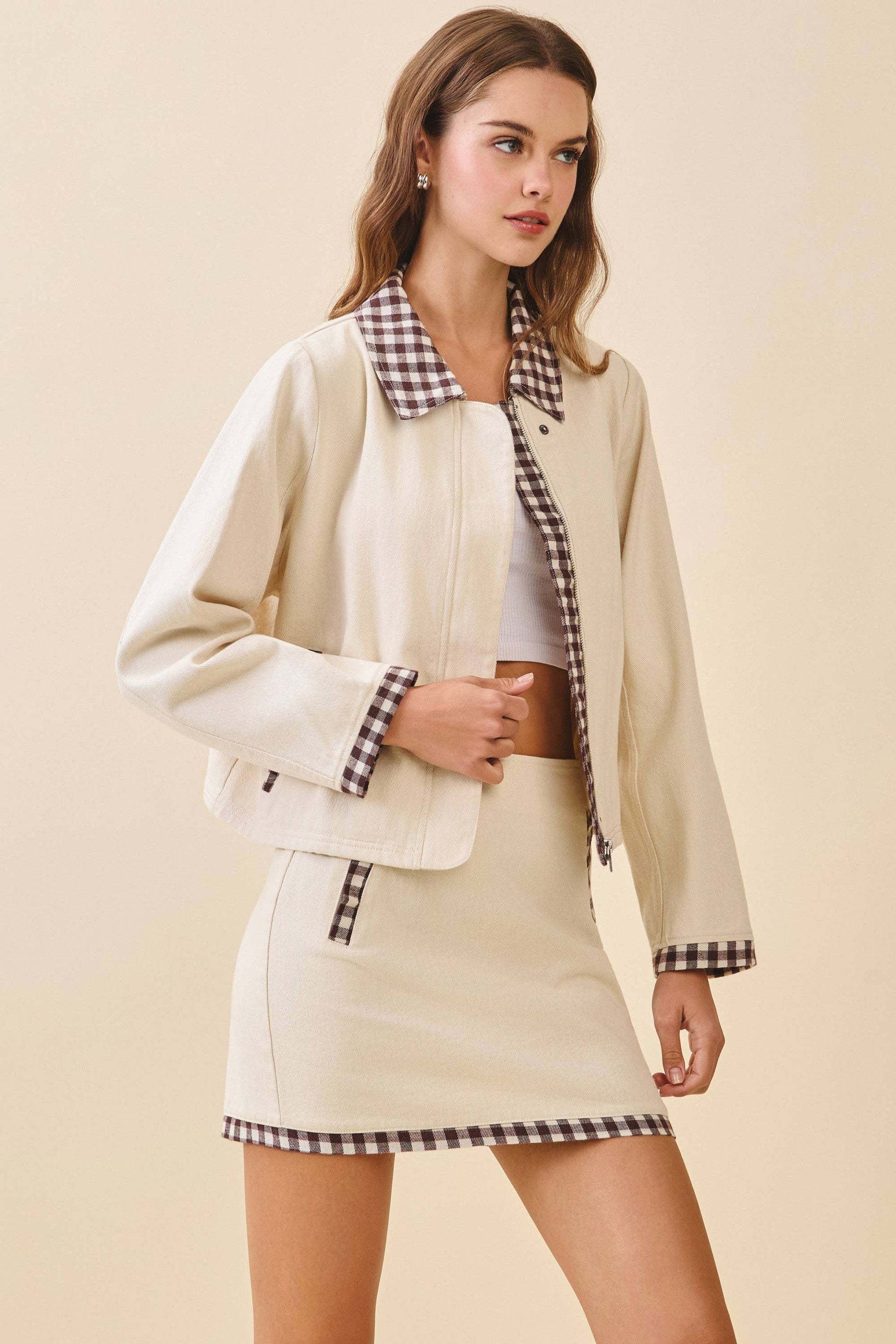 Off-white jacket featuring a pointed collar, long sleeves, and a front zip closure with snap button detail. Finished with contrast gingham trim at the collar, cuffs, placket, and pockets.