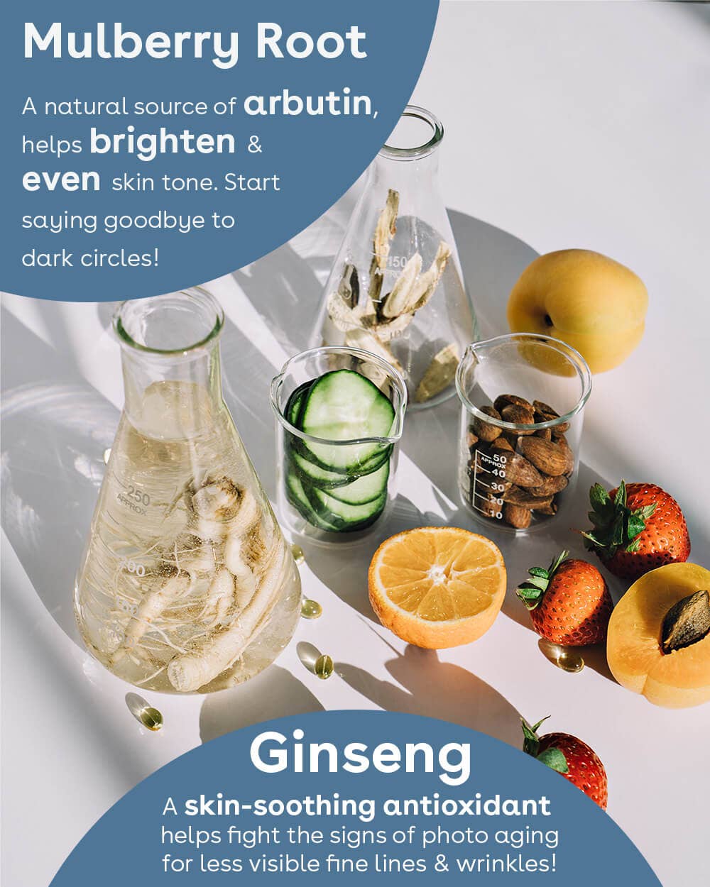 THE MAGIC OF MULBERRY, CUCUMBER, AND GINSENG For centuries, women in Korea have trusted their delicate under eyes to Mulberry Root with its a natural source of antioxidants that help balance uneven skin tone. Ginseng helps reduce the appearance of fine lines and wrinkles while Cucumber reduces puffiness. The result is a potent cocktail of natural powerhouses that keep your skin looking fresh & awake.