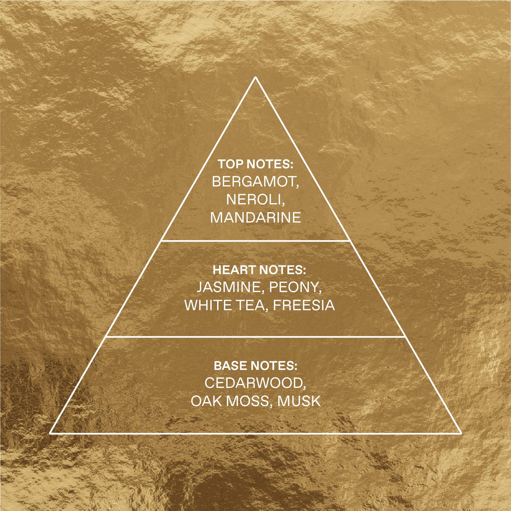 A fresh fragrance bringing together notes of freshly-cut beautiful flowers and invigorating citrus fruits, underlined by the delicate scent of precious white tea, wrapped in cedarwood and oak notes.
